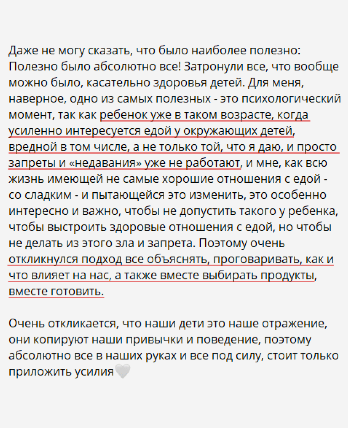 Полезно было абсолютно все! Затронули все, что вообще можно было, касательно здоровья детей. Для меня, наверное, одно из самых полезных - это психологический момент, так как ребенок уже в таком возрасте, когда усиленно интересуется едой у окружающих детей, вредной в том числе, а не только той, что я даю, и просто запреты и «недавания» уже не работают, и мне, как всю жизнь имеющей не самые хорошие отношения с едой - со сладким - и пытающейся это изменить, это особенно интересно и важно, чтобы не допустить такого у ребенка, чтобы выстроить здоровые отношения с едой, но чтобы не делать из этого зла и запрета. Поэтому очень откликнулся подход все объяснять, проговаривать, как и что влияет на нас, а также вместе выбирать продукты, вместе готовить.