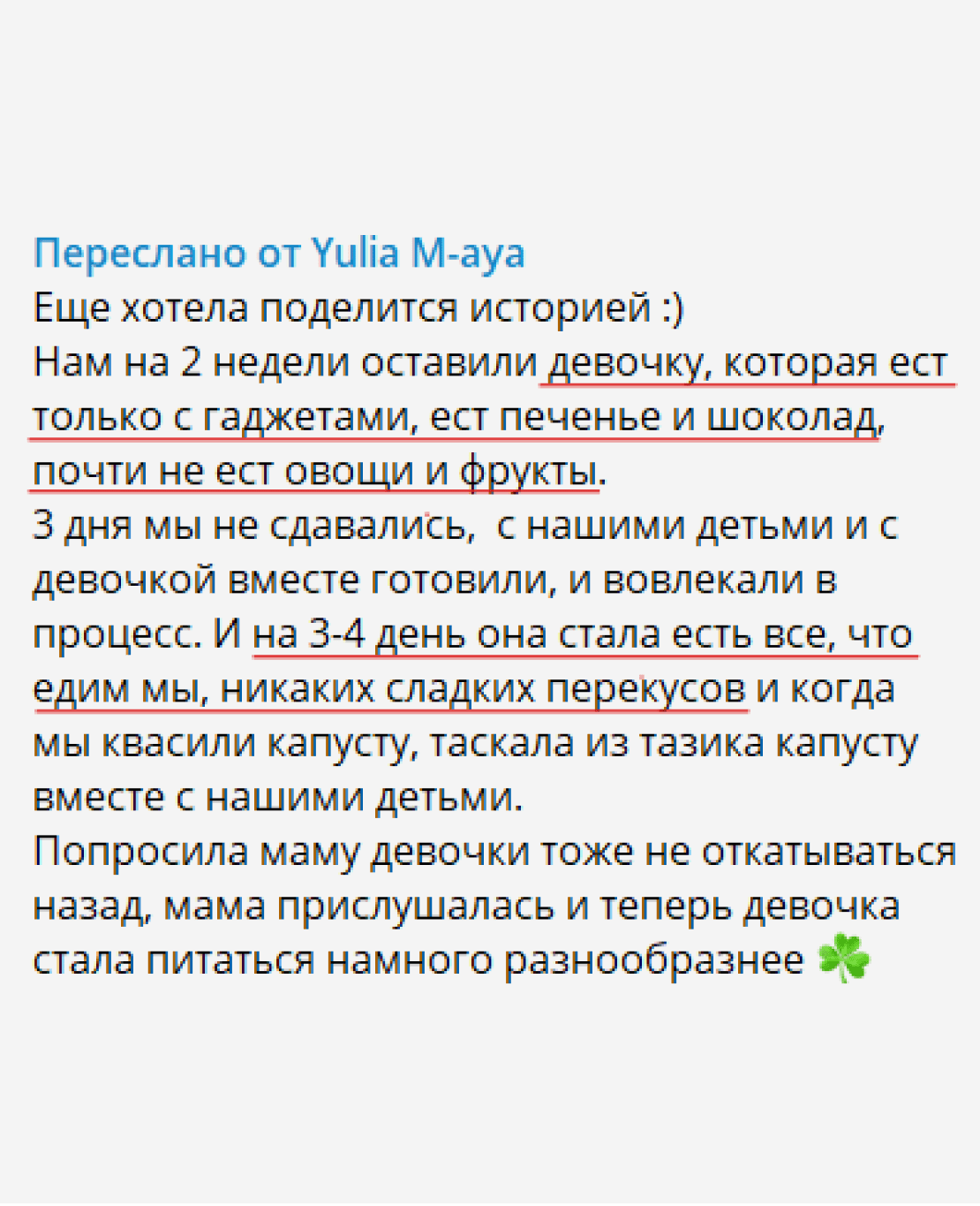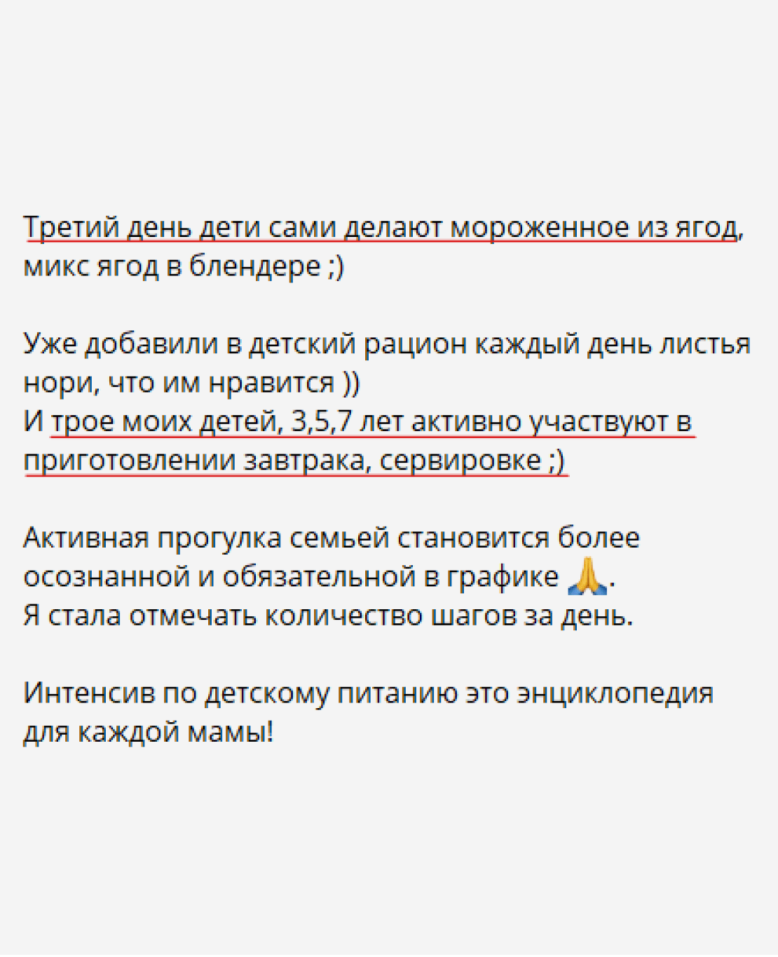 Я начала задумываться, насколько уникален каждый из моих детей, и все дети вокруг, и уважать их индивидуальные потребности и склонности. Надя показала, что формирование привычек здорового питания — это не только то, что мы кладем ребёнку на тарелку, но и создание благоприятной среды, в которой дети чувствуют себя увиденными, услышанными и любимыми такими, какие они есть. ♥️