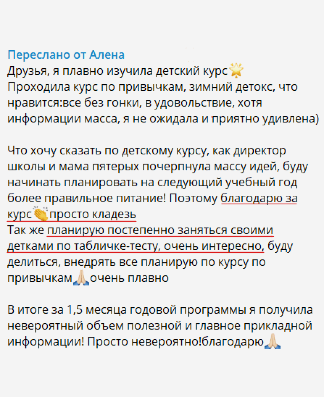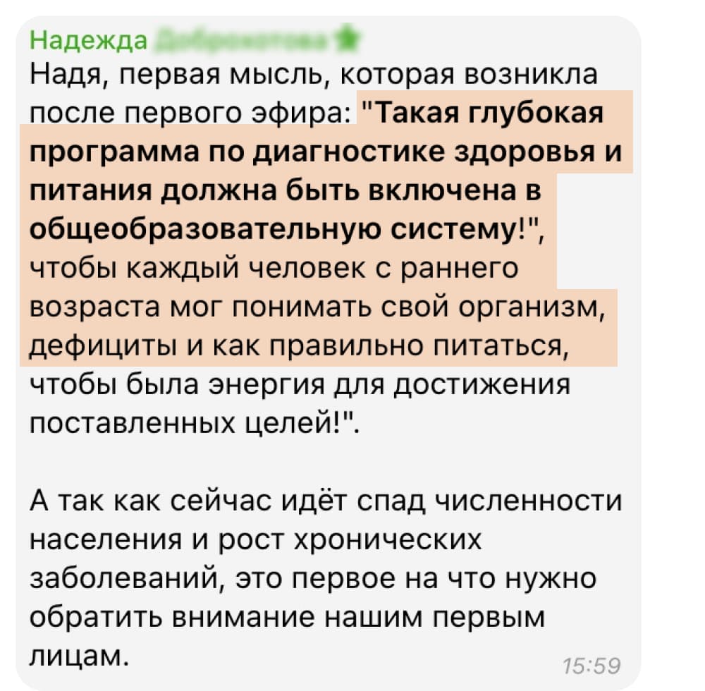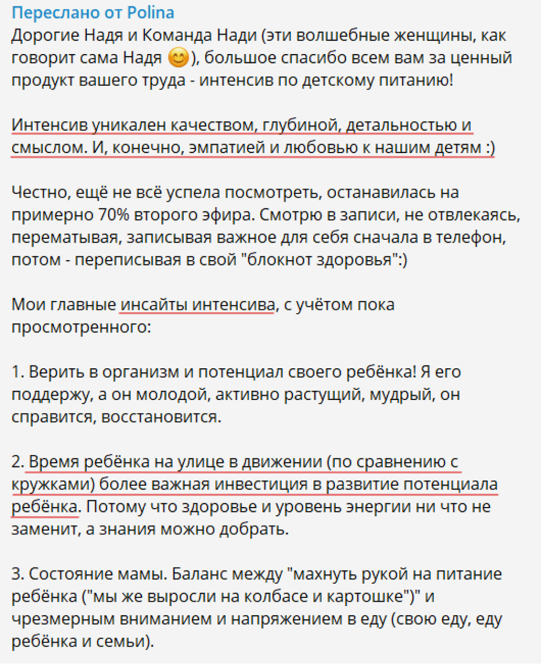 Добрый вечер! Хочу поблагодарить Надю и команду за замечательный интенсив. Я с Надей уже много лет - черпаю, вдохновляюсь и до сих пор не оставляю попытки устойчиво внедрить новые привычки. Мой основной инсайт и то, что помогает мне все это время - это принцип двигаться в своем ритме и относится к нему с уважением. Реально внедряю по крупицам, но очень стараюсь не останавливаться. Помогает когда-то сказанная Надей метафора, что вода, которая стоит на огне обязательно закипит, главное не убирать ее с этого огня. И удивительно то, что эти небольшие, но регулярные действия дают результат. Моей малышке полтора года. Я каждый день добавляла овощи, которые она ну очень неохотно ела. Поменяла подачу и принцип. Стала блендерить и делала из них соус к гарниру, мясу, рыбе. Теперь овощи регулярно, стул на отлично и прошли покраснения на попе. И еще Надя меня вдохновила на позднее материнство в 43 и я была в отличной форме, благодаря пройденным программам. Спасибо дорогие за вашу работу и прекрасное сообщество! Бесценно