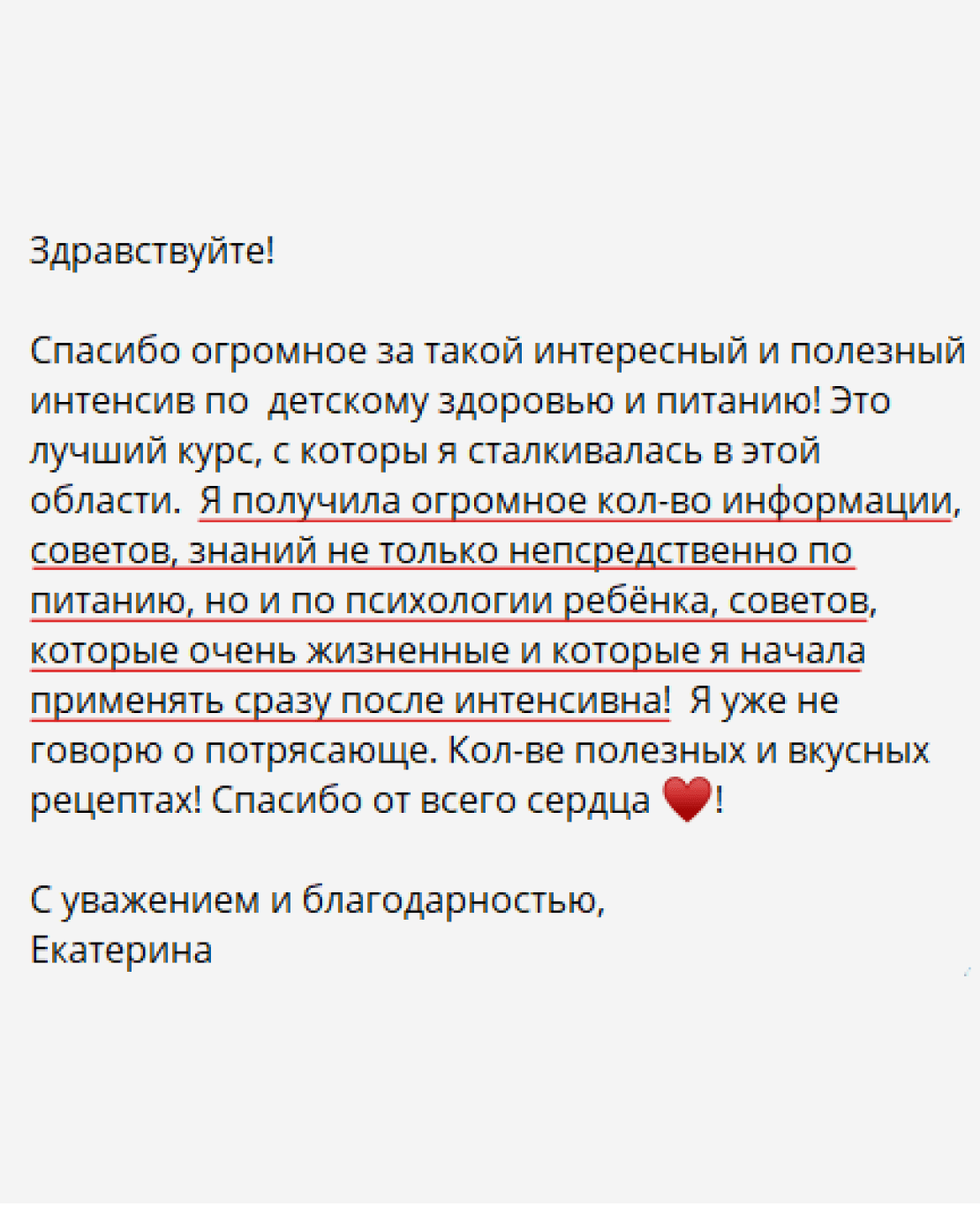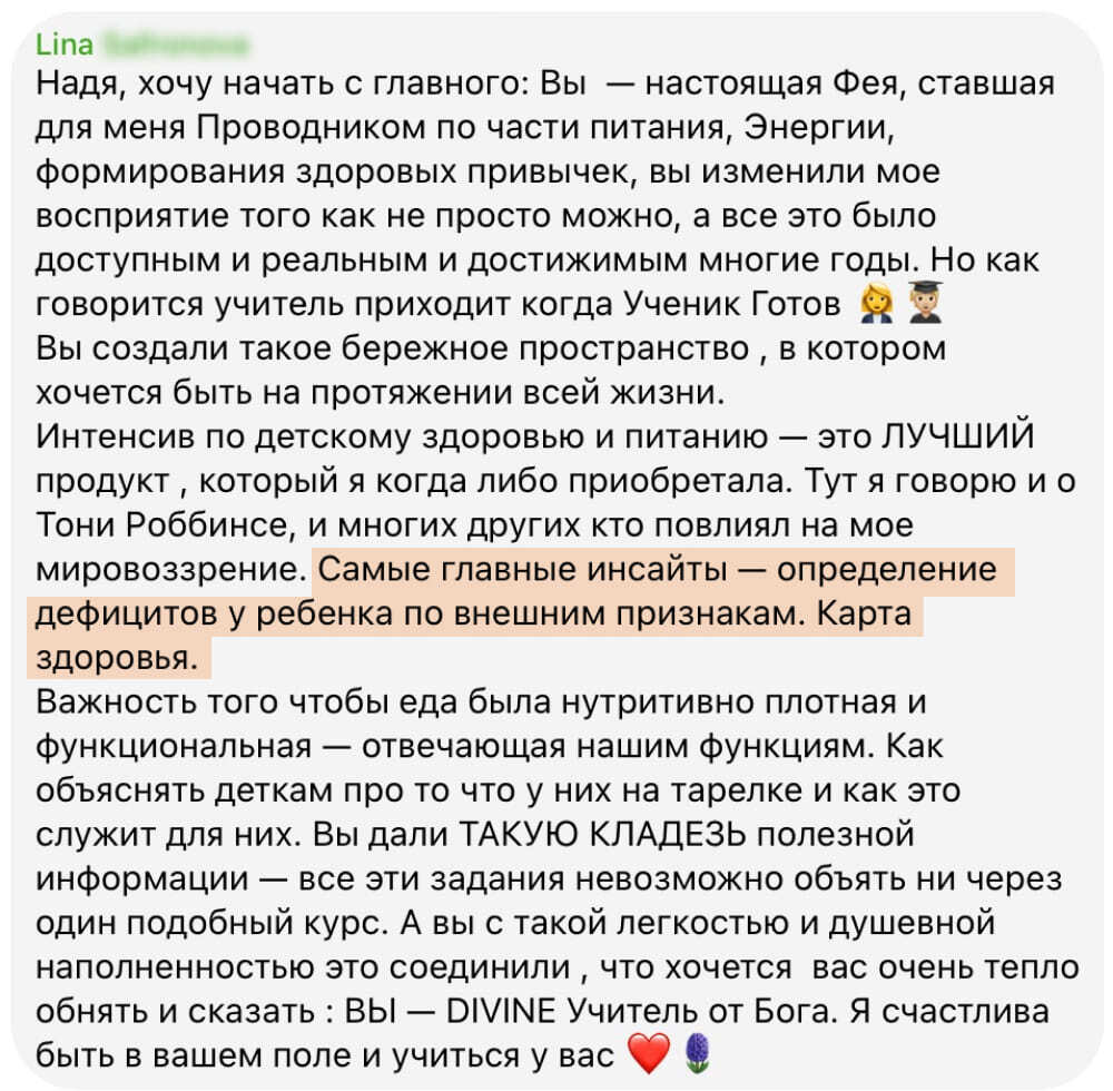 Хочу выразить Наде и всей команде свою благодарность за невероятно глубокий вебинар. То, что я расценивала как получение рекомендаций по питанию для детей, рецептов и списка БАДов, оказалось мягким и мудрым путешествием в самую суть родительства и воспитания.